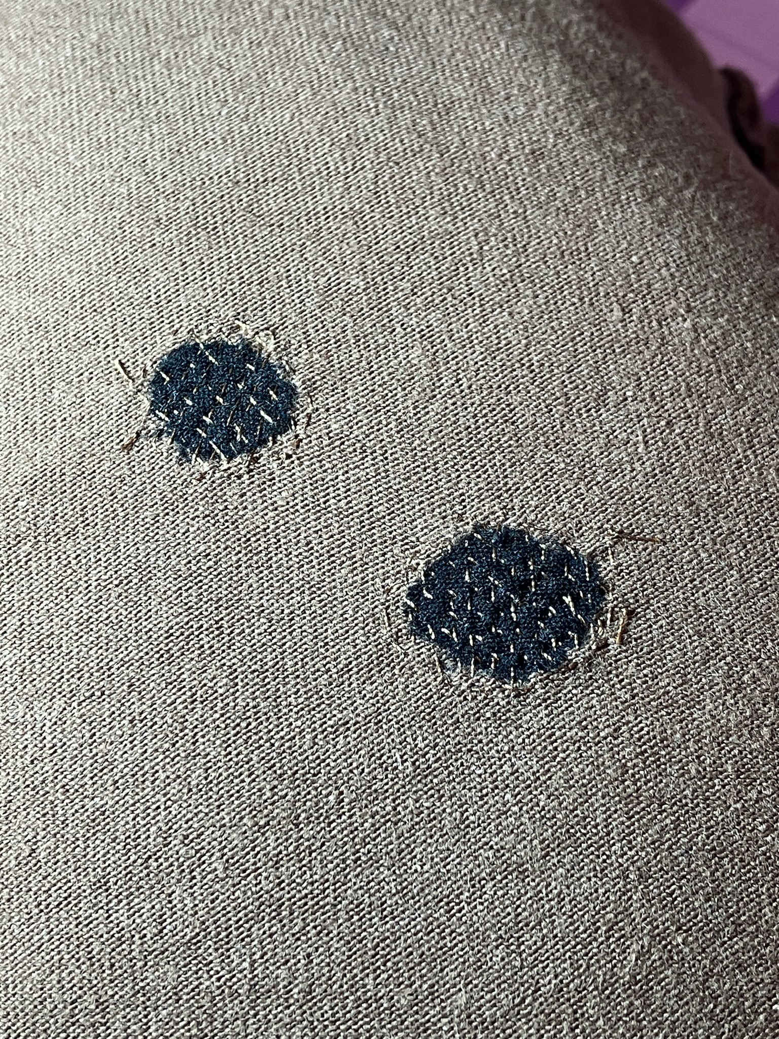 We don't need to completely bury the patch in stitches, just get it sewn down enough so that it fully reinforces the hole and can't come up around the edges.